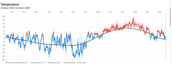 Temperatures measured at Svalbard Airport from October 2023 to October 2024. Red color: above zero degrees C. From: Norwegian Meteorological Institute [19].