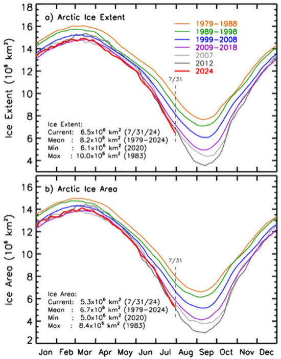Ten-year averages between 1979 and 2018 and yearly averages for 2007, 2012, and 2024 of the daily (a) ice extent and (b) ice area in the Northern Hemisphere and a listing of the extent and area of the current, historical mean, minimum, and maximum values in km2 [20].