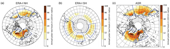 Annual mean occurrence of polar low (PL) activity for the Northern and Southern Hemispheres, respectively. A black contour encircles regions with more than 24 h of polar low activity per year [35]. The figure is obtained by applying an objective tracking algorithm to data from (a,b) ERA-I and (c) Atmospheric System Research, ASR. The color represents the annual average of PL duration within a radius of 220 km, which is calculated by multiplying the number of detected PL points by the temporal resolution of the reanalysis.