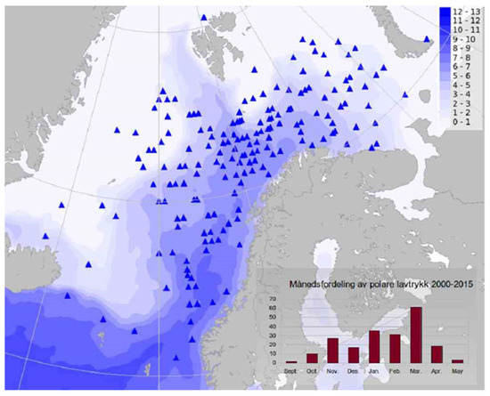 A detailed map showing the occurrence of polar lows in the Norwegian and Barents Seas is shown in Figure 7 [38]. The figure also shows the monthly distribution of polar low pressures. The probability of a polar low from mid-May to mid-September is low. For further information, see [39]. It is expected that some polar lows originating in the Russian part of the Barents Sea are not registered in Figure 7.