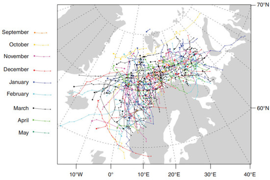 Polar tracks over the Nordic Seas during the winters of 1999/2000 to 2012/13 [40].