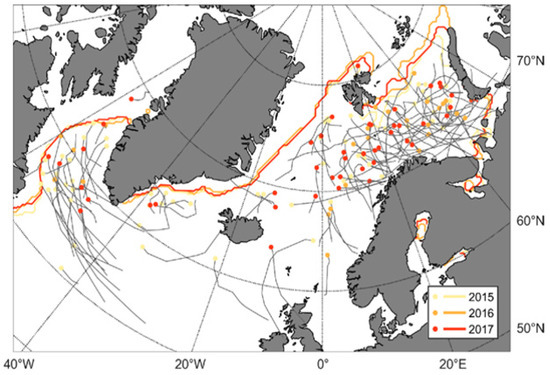 Tracks for polar low pressures during 2015–2017 [41]. The further south an operation shall be carried out, the lower the probability of encountering a polar low pressure. Legend: Thick colored circles represent locations of the first observation of a polar low, and colored lines represent median sea ice extent. The thin grey lines indicate the trajectories of the identified polar lows.