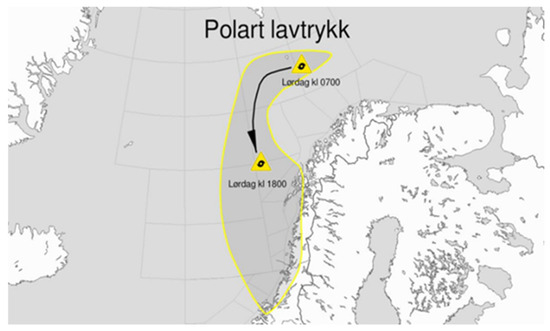 Possible track for a polar low pressure on 5 March 2021 [42]. Legend: Polart lavtrykk = Polar low pressure. Lørdag = Saturday.