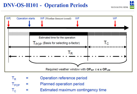 To handle the uncertainties in weather forecasts, DNV [50] has introduced a factor limiting the allowable weather when a marine operation can be carried out, the OPLIM, by an alpha factor. The duration of the marine operation is called the reference period, TR, which is the sum of the Planned Operation Period, TPOP, and a Contingency Time, TC. The weather forecast (WF) for the Reference Period shall thus be OPWF = α × OPLIM; see Figure 11 [50]. For guidance regarding the development of the alpha factor, see [51].