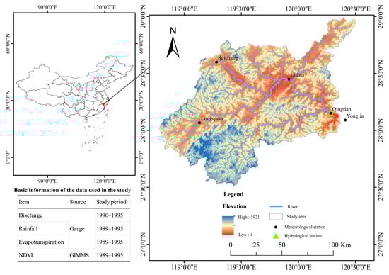 The Ou River is the second largest river in the Zhejiang Province, bounded by 118°45′ E–121°00′ E and 27°28′ N–28°48′ N (Figure 1). It traverses the mountainous region of southern Zhejiang and flows eastward into the East China Sea. The study area is the basin upstream of the Qingtian Hydrological Station, covering a drainage area of 13,735 km2. It is characterized as a mountainous river basin in a subtropical monsoon climate zone, featuring significant elevation variations and dense forest cover [29]. The primary vegetation types include evergreen coniferous forests, broad-leaved forests, mixed coniferous and broad-leaved forests, and a substantial proportion of artificial vegetation [30].