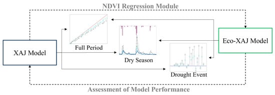 Figure 2 shows the flowchart of this study. In this study, an eco-hydrological model based on the Xinanjiang (XAJ) model, called Eco-XAJ, is proposed, which incorporates vegetation change into the model using an NDVI regression module. Then, the discharge simulation performance of the Eco-XAJ model and the XAJ model is compared during the full period, the dry seasons, and the drought events in the Ou River basin.