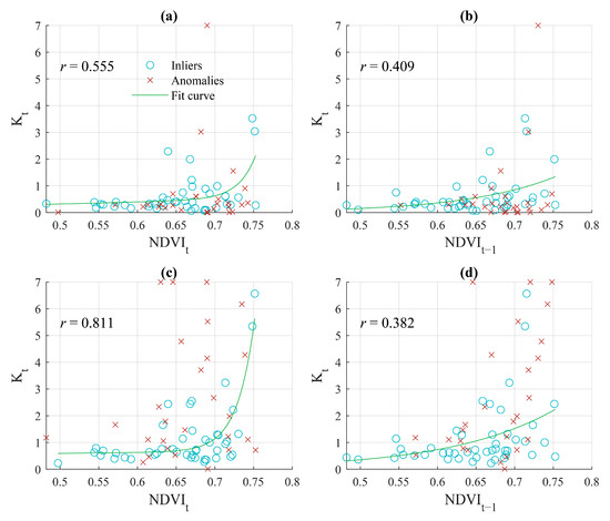Scatter plot of K and the NDVI: (a,b) represent the XAJ-UH model and (c,d) represent the XAJ-LR model. and indicate the relationship for the same month; and indicate the relationship with a one-month lag.