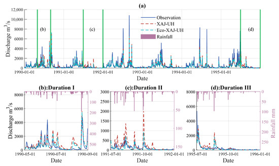 Hydrograph of the Eco-XAJ-UH model in (a) the full period, (b) Duration I (the wet season), (c) Duration II (the dry season), and (d) Duration III (the recession periods).