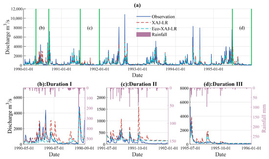 Hydrograph of the Eco-XAJ-LR model in (a) the full period, (b) Duration I (the wet season), (c) Duration II (the dry season), and (d) Duration III (the recession periods).