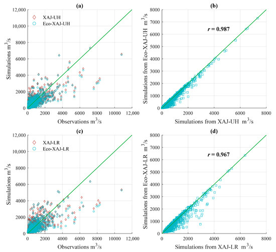 Comparison of the simulation (a,b) between the XAJ-UH model and the Eco-XAJ-UH model, and (c,d) between the XAJ-LR model and the Eco-XAJ-LR model.