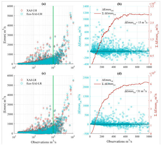 For a more detailed analysis, the error plots of the Eco-XAJ model corresponding to the observed discharges are presented in Figure 8. Figure 8a,c illustrates the fact that when the observed discharge is below approximately 1000 m3/s, the absolute error of the Eco-XAJ model is generally lower than that of the XAJ model. As shown in Figure 8b,d, the error analysis of the discharge less than 1000 m3/s is conducted, where a ∆Error greater than 0 indicates that the Eco-XAJ model outperforms the XAJ model. The red solid line shows the cumulative ∆Error. If the slope of the cumulative ∆Error is greater than 0, it indicates that the advantage of the Eco-XAJ model is increasing. According to Figure 8b,d, it is evident that the difference between the Eco-XAJ-LR and XAJ-LR models is more pronounced as compared to that between Eco-XAJ-UH and XAJ-UH. The cumulative ∆Error in Figure 8d is approximately twice that shown in Figure 8b. This indicates that the improvement in the simulation accuracy of Eco-XAJ-LR is greater than that of Eco-XAJ-UH. Furthermore, both subplots reveal that the advantage of the Eco-XAJ models increases with discharge ranging from 0 m3/s to 600 m3/s. However, in the range of the discharge from 600 m3/s to 1000 m3/s, the slope is approximately 0, suggesting that the advantage of the Eco-XAJ models weakens.