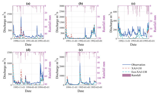 Hydrograph of Eco-XAJ-UH and the original model during the dry seasons of (a) 1990, (b) 1991, (c) 1992, (d) 1993, and (e) 1994.