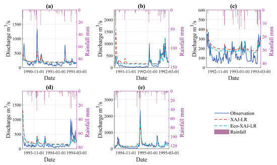 Hydrograph of Eco-XAJ-LR and the original model during the dry seasons of (a) 1990, (b) 1991, (c) 1992, (d) 1993, and (e) 1994.