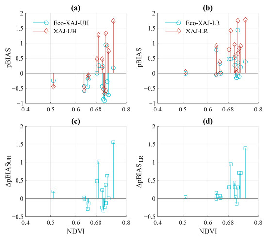 Figure 11c,d, indicates that the Eco-XAJ model outperforms the XAJ model in a simulation in which the value on the vertical axis is greater than 0. Conversely, if the value is less than or equal to 0, it suggests that there is no improvement. As shown in Figure 11c, in cases where the model’s performance improves, the magnitude of the improvement is greater than the magnitude of the decline observed in cases where the performance does not improve. It suggests that the Eco-XAJ-UH model generally performs better than the XAJ-UH model. Furthermore, Figure 11c illustrates that the improvement in the water-balance simulation performance of Eco-XAJ-UH, as compared to XAJ-UH, is relative to the NDVI, with more noticeable improvement when the NDVI exceeds 0.68. In Figure 11d, the Eco-XAJ-LR model shows an improvement in water balance simulation as compared to the XAJ-LR model, with only two events having negative values of near 0. Moreover, similar to the Eco-XAJ-UH model, when the NDVI exceeds 0.68, the Eco-XAJ-LR model demonstrates a noticeable enhancement in water balance simulation as compared to the XAJ-LR model.