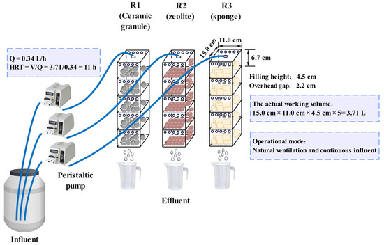 In this study, ceramic granules, zeolites, and sponges were selected as the test fillers for the lab-scale reactor of the BTF. The test set-up (Figure 1) consisted of an inlet bucket, inlet peristaltic pumps, three parallel lab-scale reactors of the BTF, and a catchment tank named R1 (packing for ceramic granules), R2 (packing for zeolites), and R3 (packing for sponges) from left to right, respectively. Each BTF reactor has 5 layers, the size of each layer is 15.0 cm × 11.0 cm × 6.7 cm, filler filling height of 4.5 cm, the actual working volume of 3.71 L, filler above the setting of the 2.2 cm-thick gap and direct contact with the air, the use of natural ventilation of the system for the supply of oxygen, set between each layer of the ventilating holes, a total of 10. The device adopts the form of a single-stage parallel connection; three parallel BTF devices were filled with ceramic granules, zeolite, and sponge; the top of the device set up a water distributor to ensure continuous and uniform water intake; and the bottom of the device set up a catchment basin to collect the water after treatment by the BTF filler. The hydraulic retention time is designed to be 11 h.