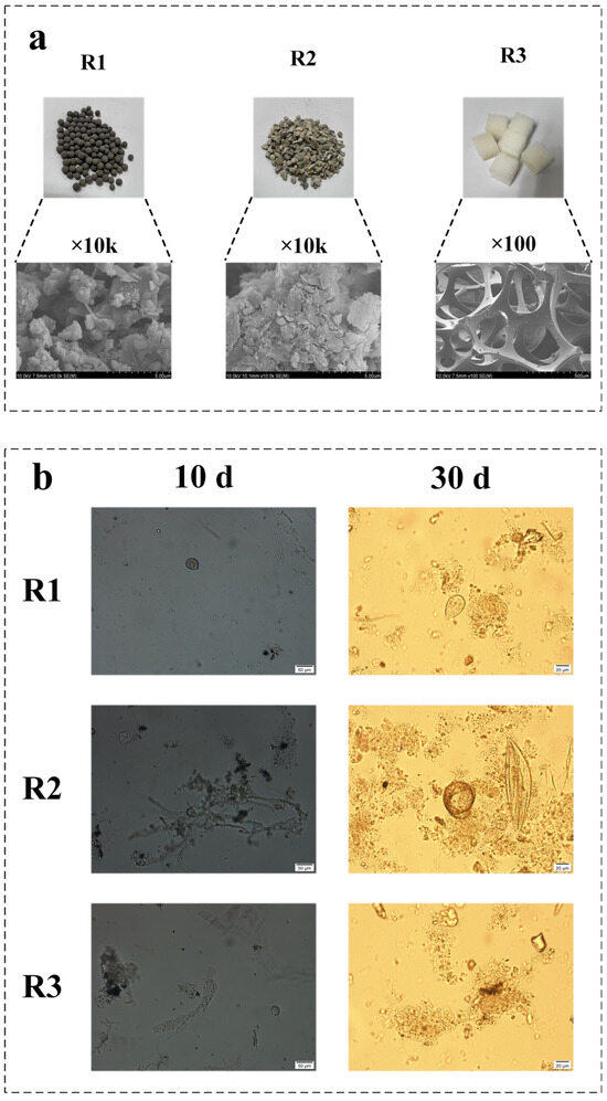 The results of biofilm microscopy before and after hanging the membrane on the filler are shown in Figure 2b. At the beginning of the membrane hanging, the changes on the surface of the filler were not obvious; with the prolongation of the experimental time, white biofilm appeared on the surface of the filler in all three BTFs, and after the end of the membrane hanging, a large number of bacterial colloid clusters could be observed in the biofilm bacterial liquid oscillating down from the surface of the filler, and other indicator organisms such as nematodes, rotifers, paramecia, and pipeworm were also observed. Bacterial colloid refers to the fusion of pod membrane substances of many bacteria into clusters containing many bacteria, which can prevent the bacteria from being phagocytosed and, at the same time, enhance the resistance of bacteria to adverse environments and have strong adsorption capacity and decomposition of organic matter [2,14]. The large number of protozoa observed in the biofilm bacterial liquid indicates that the biofilm is more stable and the surface of the packing has been hung successfully. Comparing the microorganisms on the surface of the filler of the three groups of reactors, on the 10th day of the operation of the system, it can be clearly seen that the biofilm on the surface of the zeolite has a higher content of bacterial colloid, indicating that at this time, a certain amount of microorganisms have already been attached to the surface of the filler, and the detection of surface biofilm on the 30th day found that the biofilm sample of the zeolite contains a larger number of protozoa, indicating that at this time, there is a higher diversity of microorganisms in the biofilm using the zeolite as a carrier [18], the biofilm system is more complex and stable [19].