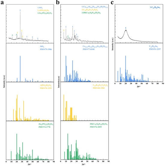 XRD patterns of fillers. (a) ceramic granule; (b) zeolite; and (c) sponge.