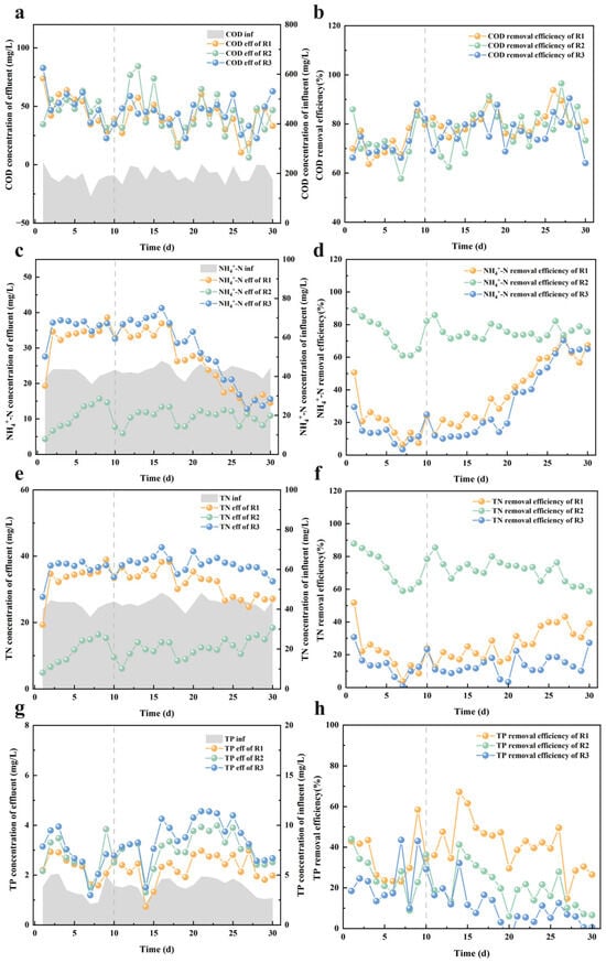 Performance of simultaneous nitrogen and phosphorus removal; (a,c,e,g) are the inlet and outlet concentrations of COD, NH4+-N, TN, and TP, respectively, and (b,d,f,h) COD, NH4+-N, TN, and TP removal rate, respectively.