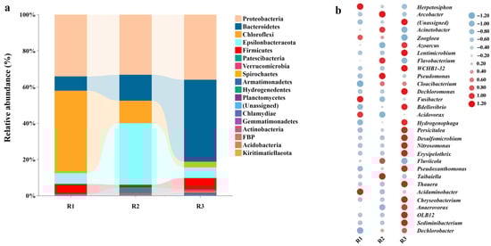 At the end of the experiment, biofilm samples were taken from the three reactors for molecular biology analysis. Total DNA was extracted using the E.Z.N.A.® Tissue DNA kit (Omega Bio-tek, Norcross, GA, USA). The V3 and V4 regions of the 16S rDNA gene were then amplified by PCR using the bacterial primers 338F 5′-ACTCCTACGGGAGGCAGCA-3′ and 907R 5′-GGACACHVGGGTWTCTAAT-3′. The DNA sequences were evaluated on an Illumina MiSeq platform by Guangdong Magigene Technology Co., Ltd. (Guangzhou, China). Kyoto Encyclopedia of Genes and Genomes (KEGG) annotation was performed using PICRUSt2 software (V2.3.0) to obtain the corresponding abundance information. Based on the pathways of the tricarboxylic acid (TCA) cycle, nitrogen metabolism, and phosphorus metabolism, metabolic analyses were carried out using KEGG data of relevant functional genes and enzymes [16].