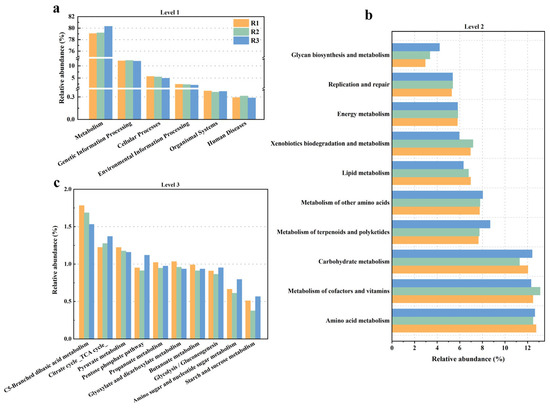 KEGG pathway analysis in different reactors. (a) Primary classification; (b) secondary classification; (c) third-level classification.