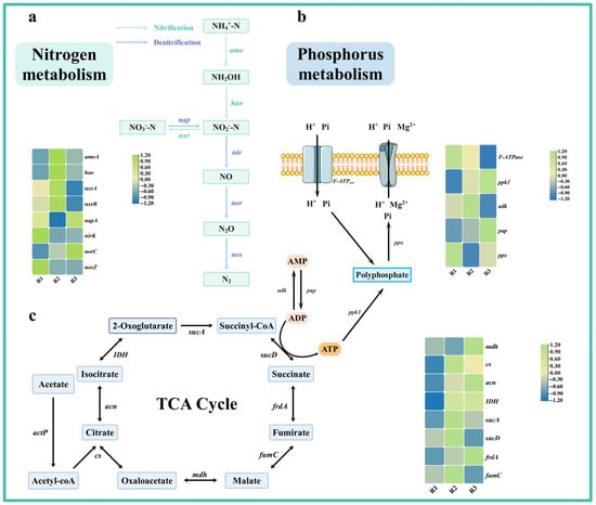 To further elucidate the effects of the three fillers on microbial metabolic functions, we evaluated the pathways involved in nitrogen metabolism, phosphorus metabolism, and the TCA cycle (Figure 7). In terms of nitrogen metabolic pathways, genes related to nitrification and denitrification processes were mainly investigated [35]. R2 had the highest NH4+-N removal rate as shown in Figure 7a, and the relative abundance of genes related to the nitrification process (amo, hao, nxr, etc.) was the highest in R2, suggesting that zeolite enhanced microbial metabolism of the nitrification process. The relative abundance of genes related to the denitrification process (nap, nir, nor, nos, etc.) in R2 was lower than that of R1 and R3, which was consistent with the fact that the effluent water of R2 still had a high NO3−-N concentration. However, R2 was still the highest in terms of TN removal because it had the strongest nitrification metabolism.