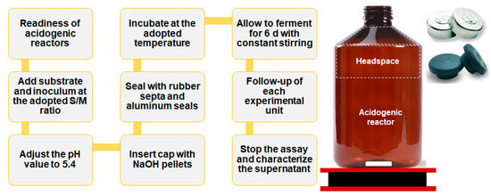 Two experiments (E1 and E2) evaluated the individual effects of the S/M ratio and temperature on VFA production from CWW by AF. Batch flow amber glass flasks with a total volume of 400 mL (200 mL for reaction and 200 mL for headspace) served as acidogenic reactors. Each reactor was loaded with the substrate and inoculum at the specified S/M ratio. The initial pH of the mixture was adjusted to 5.4 using Na2HPO4 (Thermo Fisher Scientific Inc., Waltham, MA, USA) or HCl (Merck KGaA, Darmstadt, Germany) solutions. The pH value was chosen based on the results of previous studies [3,24]. A magnetic bar to promote complete mixing and a cap with two NaOH (Merck KGaA, Darmstadt, Germany) pellets for CO2 absorption were inserted into each reactor. The reactors were then sealed with rubber septa and aluminum seals and incubated at the designated temperature for 6 d [18]. A control was established for each experiment.