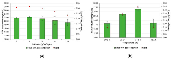 Production and yield of VFAs by AF of CWW. (a) Effect of the S/M ratio and (b) effect of the temperature.