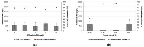 Final carbohydrate concentration and uptake in AF of CWW. (a) Effect of the S/M ratio and (b) effect of the temperature.