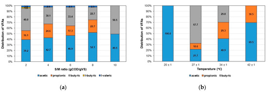 Distribution of VFAs produced in AF of CWW. (a) Effect of the S/M ratio and (b) effect of the temperature.