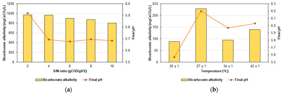 When evaluating the S/M ratio, Figure 5a indicates that pH values ranged between 5.68 and 5.92. Although the final pH was higher than the initial in all bioreactors, the lowest values were observed for S/M ratios greater than or equal to 4 gCOD/gVS. In terms of bicarbonate alkalinity, the initial value in the bioreactors was 410.56 ± 16.84 mgCaCO3/L, increasing to between 803.20 and 969.97 mgCaCO3/L by the end of the experiment (6 d). The final bicarbonate alkalinity decreased as the S/M ratio increased. Additionally, in Figure 5b, the final pH ranged between 5.57 and 6.20 when the temperature was evaluated. The higher pH was recorded at 27 ± 1 °C. Furthermore, the initial bicarbonate alkalinity was 0 mgCaCO3/L, increasing to a range of 88.69 to 229.37 mgCaCO3/L by the end of the test. Alkalinity was notably higher at temperatures of 27 °C (229.37 mgCaCO3/L) and 42 °C (139.71 mgCaCO3/L). In both experiments (E1 and E2), the conditions with the highest alkalinity also exhibited the highest pH values at the conclusion of the AF test.
