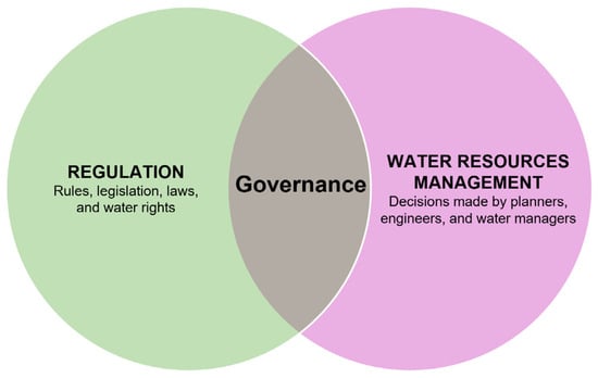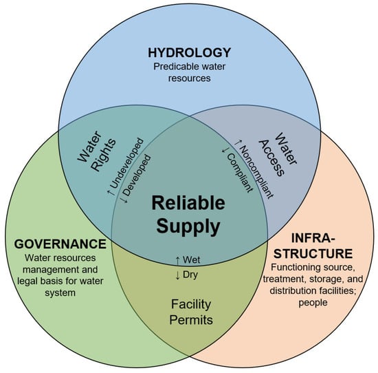 Governance, the final component, considers the legal basis of a water supply. It includes the management of the water system in guaranteeing that it meets regulatory requirements. It also considers decisions that water managers make in supply planning. It overlaps with the other components through the administration of water rights or “paper water” (for hydrology) and facility/operating permits (for infrastructure). A supply without governance would be noncompliant (e.g., water theft).