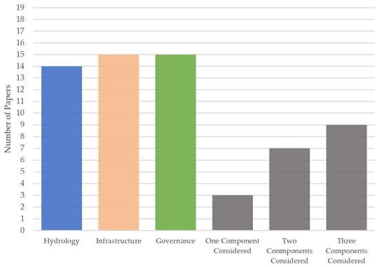 The textual analysis shown in Table 2 yielded positive results for our definition as most of the considered factors consistently fit within hydrology, infrastructure, or governance. Some factors often overlapped across two or more areas and are shown in the “multiple” category. A significant portion of papers identified multiple factors that fell within at least two areas of our definition. Breaking the analysis down by recurring factors shows more specific elements within the larger components. A reliable water supply should, at some point, consider factors of the three components as any of them could potentially be a limiting feature.