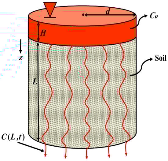 In Figure 1, is the constant head of solute on the soil column ; is the diameter of the cylindrical soil sample ; is the length of the soil column ; is the initial concentration of solute at the top of the soil column ; is the concentration of solute exiting the soil column bottom ; and is the direction of solute movement in the vertical direction or toward the ground.