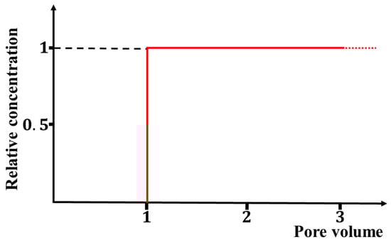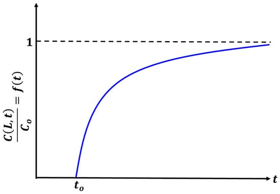 If , then the concentration is equal to zero (see Figure 2). Thus, , and according to Equation (17), . Therefore, the corresponding function for the breakthrough curve is as follows: