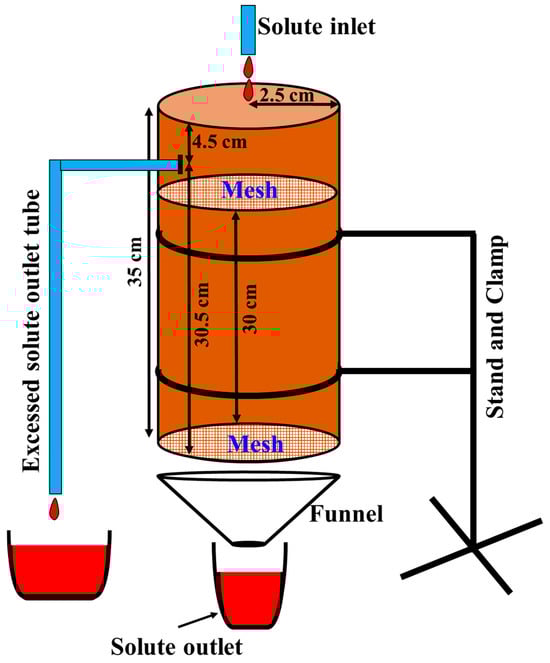Seven cylindrical vessels (each with a diameter and height of 5 and 35 cm, respectively) were selected. A 4.5 cm hole was made at the top edge of each cylinder to provide an excess solute outlet tube. The bottoms of the cylinders were covered using a metal mesh with a diameter of 47 μm. Seven soil samples were slowly poured into the cylinders, filling them up to a height of 30 cm. Then, the weight of all filled cylinders was measured. Two plastic nets with a 1 mm diameter were placed on the upper surface of the soil samples to reduce inflow turbulence. Figure 3 shows the laboratory model.