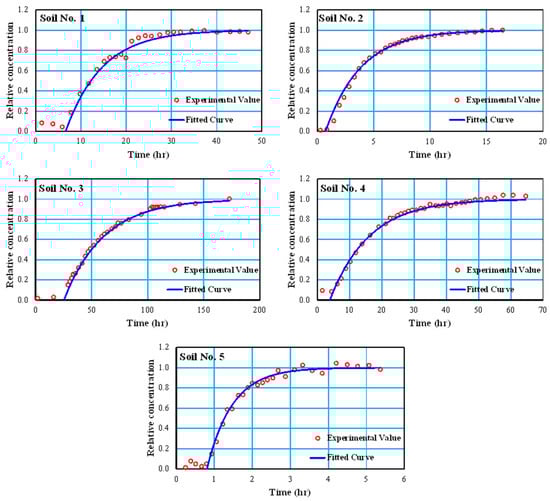 To fit the breakthrough curve , it can be made linear by taking its natural logarithm, yielding . Assuming , , , and , for , and , the breakthrough curve data are obtained as a linear function. Then, its parameters and are determined through curve fitting based on the least squares error method. Subsequently, the values of and are obtained. Using a similar method for five different soil textures and fitting the breakthrough curve data in Excel, the values of and are obtained for each soil sample. Figure 4 shows the breakthrough curves and their fits; here, data that would have unduly affected the curves were excluded.