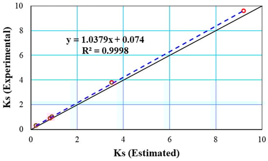 As shown in Table 1, the estimated values closely align with the experimental results. Equation (39) proves particularly accurate for soil samples with larger particle sizes. Figure 5 illustrates a strong correlation between the calculated and experimental data points with the first quadrant bisector. Ideally, the points would lie precisely on this bisector, though minor deviations are observed in the results obtained from Equation (39), resulting in a slight relative error.