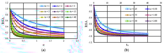 In Equations (40) and (41), the absolute value of RAS ranges between zero and unity . A value of RAS equal to zero indicates that Equation (39) exhibits minimal sensitivity to parameter or . As the RAS value approaches 1, the sensitivity of Equation (39) to the specified parameter increases correspondingly. So, according to Figure 7a, it is evident that for a fixed value of , the RAS value of Equation (39) decreases as the parameter increases. Likewise, for a fixed value of , the RAS value decreases as increases. In Figure 7b, which examines the RAS of Equation (39) with respect to changes in , it is clear that for a fixed value of , the RAS increases with increasing . Similarly, for a fixed value of , the RAS increases as increases.