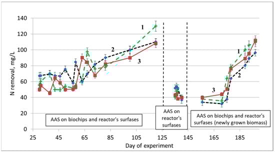 3.3. Dynamic of Bioreactor Technological Characteristics: Efficiency of Biochip Circulation and Nitrogen Removal