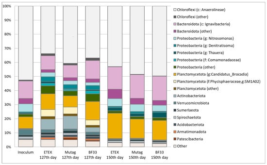 - Pimenov, N.; Nikolaev, Y.; Dorofeev, A.; Grachev, V.; Kallistova, A.; Kanapatskiy, T.; Litti, Y.; Gruzdev, E.; Begmatov, S.A.; Ravin, N.; et al. Introduction of exogenous activated sludge as a way to enhance the efficiency of nitrogen removal in the anammox process. Microbiology 2022, 91, 356–363. [Google Scholar] [CrossRef]