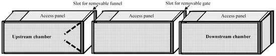 Two instream flumes constructed of expanded aluminum mesh (Figure 1), each consisting of three chambers, were deployed in the Ocqueoc River, Michigan, during 2015 and the Black Mallard River, Michigan, during 2016. The flumes were divided into three chambers and deployed parallel to stream flow so that water flowed lengthwise through the flumes. Experiments were conducted using a run-of-river approach, and average water velocity in the chambers was approximately 0.1 m/sec from upstream to downstream. The chamber furthest upstream was separated using removable funnels; the chamber furthest downstream contained plastic tubes to provide shelter for sea lampreys and was separated from the upstream chambers by a removable gate. Underwater cameras were installed along the bottom of the middle chamber to view the downstream side of the removable funnels. To ensure sea lampreys used for this experiment were naïve to funnel traps, test animals were captured from nearby streams using eel ladder-style traps. The eel ladder-style traps consist of studded ramps that sea lampreys can climb due to their anguilliform movement. Sea lampreys simply climb the ramps into collection pots (i.e., funnel-less traps). Collection occurred during the early spring migratory season, and sea lampreys were held in flow-through tanks at Hammond Bay Biological Station. Hypolimnetic water was supplied to the tanks from Lake Huron at an ambient temperature (~6° C), which slowed the maturation process and maintained the sea lampreys at an immature migratory stage of development.