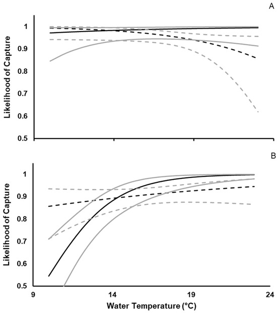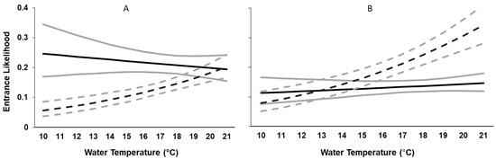 Figure 2. Likelihood of a sea lamprey entering a trap with bottom-oriented funnel (solid line) compared to center-oriented funnel (dashed line) relative to water temperature (Panel A). Likelihood of a sea lamprey entering a trap funnel (bottom or center-oriented) equipped with retention fingers (solid line) or without (dashed line) (Panel B). Ninety-five percent confidence intervals are shown with grey lines.