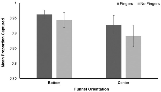 Figure 3. Averge proportion of sea lampreys captured by experimental trap entrances installed in an instream, experimental flume. Proportions were compared for center-oriented and bottom-oriented funnels with and without retention fingers installed. Error bars represent standard error.