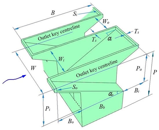 - At the downstream surface, the outlet key floor is also lowered with a 90° isosceles triangle. The vertex is 0.5Wo below the original floor level; the inlet key height becomes Po + 0.5Wi.