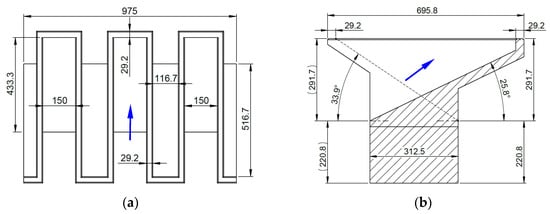 Modified weir with triangular overhangs—model dimensions (unit mm). (a) Plan view; (b) Longitudinal profile. The blue arrow indicates the flow direction.