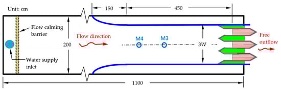 As shown in Figure 6, the model tests are performed in an 11.0 m long and 2.0 m wide flume, with the weirs mounted at its downstream end. A 200 mm pipe conveys water into the test rig, with a perforated barrier installed close to the downward inlet to damp the flow turbulence. As the model width (3W = 97.50 cm) is smaller than the flume width, a channel is set up in the middle, with a streamlined transition upstream.