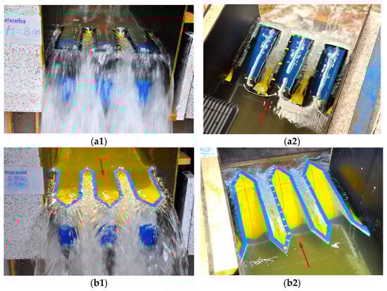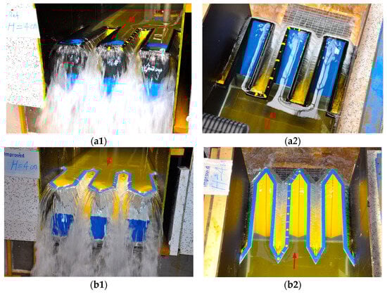 The weirs in the flume—the weir base is mounted flush with the floor at the flume’s lower end, resulting in free falling jets onto the floor. (a) Reference weir; (b) Modified weir.
