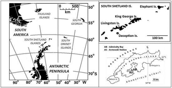This research was conducted at the Henryk Arctowski Polish Antarctic Station, located on the western coast of Admiralty Bay (King George Island, West Antarctica) (Figure 1). The area of the bay is 122.08 km2, the maximum depth is 530 m, the water volume is estimated at 24.24 km3, and the catchment area is 361 km2 [31,32,33].