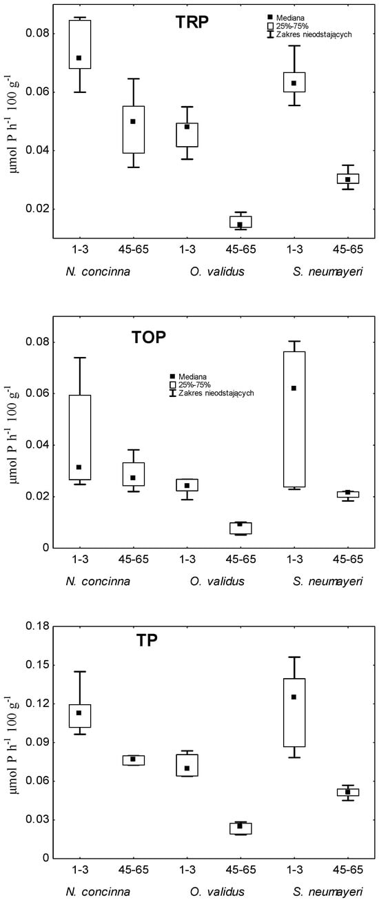 Comparison of the excretion of the tested forms of phosphorus during the first three days of zoobenthos starvation (1–3) and between 45 and 65 days of starvation (45–65) (■—median,