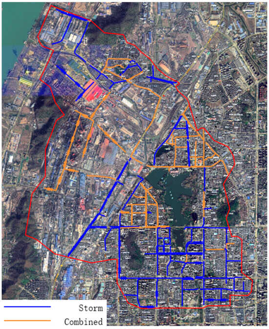The stormwater pipeline system in the study area spans 49.836 km, representing 60.53% of the total drainage network. The combined sewer system covers 32.502 km, accounting for 39.47% of the network. The conduits feature primarily rectangular and circular cross-sections, with the largest section measuring 2000 mm × 2500 mm and the smallest measuring 1400 mm × 800 mm. The diameter of circular pipes ranges from a minimum of 200 mm to a maximum of 2300 mm. The gradient of these conduits varies between 0.1% and 0.3%. The materials used for the pipes include concrete, brick and stone, cast iron, and plastic. Before constructing a one-dimensional drainage network model for the Yushan Lake area, the network was generalized. This process involved removing stormwater inlets and merging pipelines of the same diameter. After generalization, the stormwater system comprised 995 nodes, 954 pipelines (564 stormwater pipelines and 390 combined sewer pipelines), and 48 outlets. The Manning coefficients used for hydraulic calculations were 0.014 for concrete pipes, 0.015 for brick-lined open channels and cast-iron pipes, and 0.013 for plastic pipes. Following a review of the topological relationships for accuracy, the topological structure of the one-dimensional network model was successfully established.